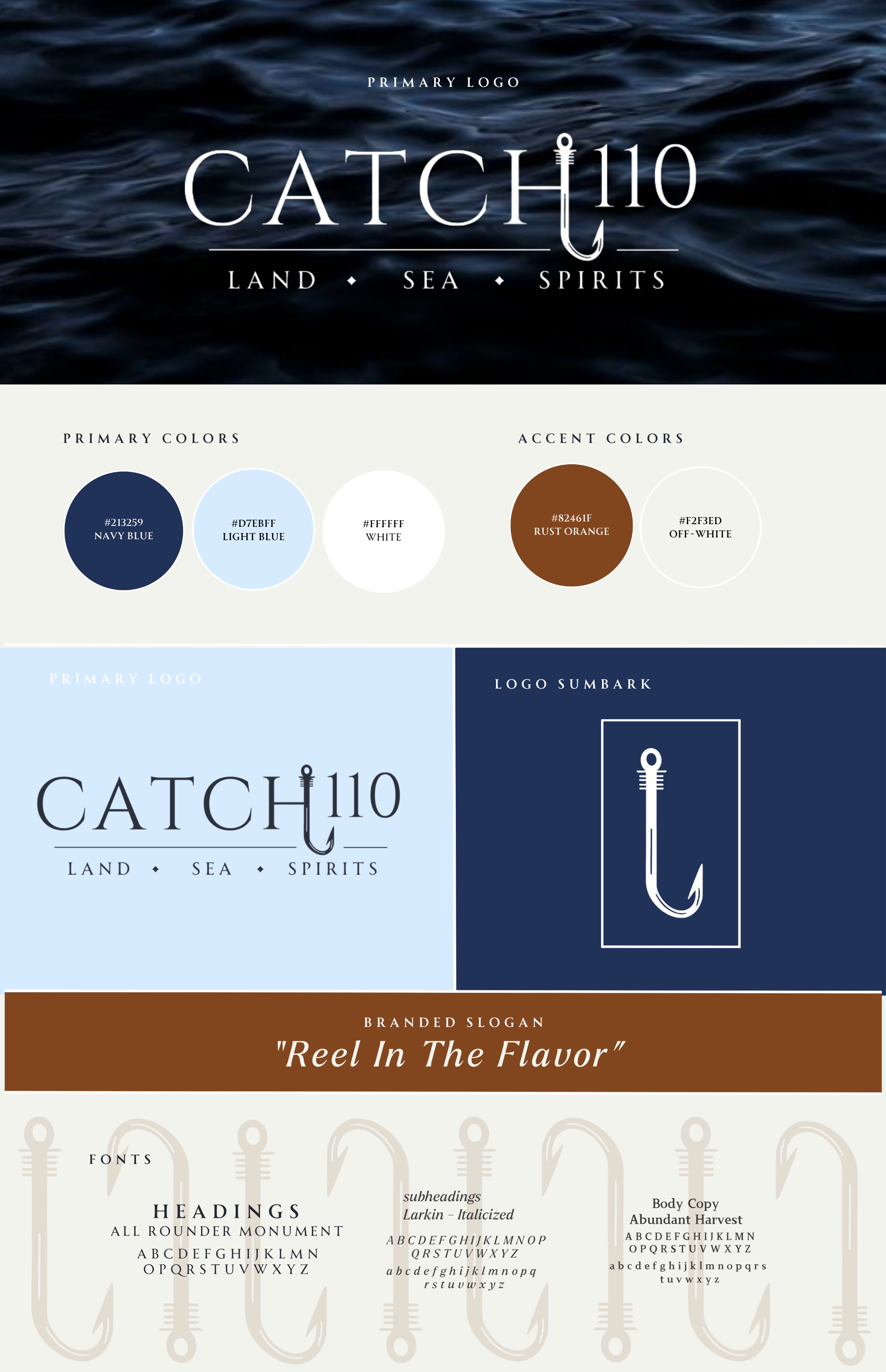 From concept to launch, I created the full visual identity for Catch 110 — including the logo, color palette, typography, brand photography, and website. Every element was designed to reflect the restaurant’s modern coastal vibe and connection to Gulf Coast heritage.